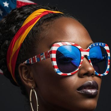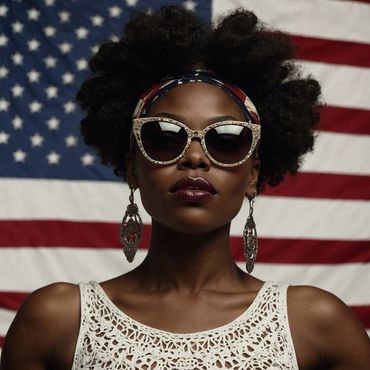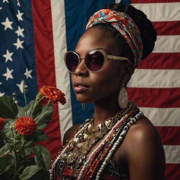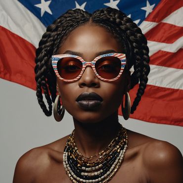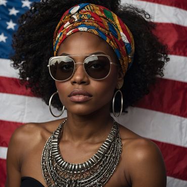 This image is more than just a portrait; it is a statement. It celebrates Black culture, strength, and beauty while also acknowledging the complexities of identity in the American context. The powerful combination of style, symbolism, and expression makes this image a compelling representation of empowerment and pride.